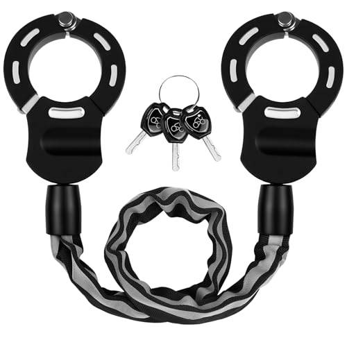 Daneben gibt es natürlich noch den Aufbau der Sicherheitskette und der Arretierung. Am ungewöhnlichsten in der Optik sind die markanten Handschellenschlösser, die aussehen wie Handschellen für Menschen. Eine lange, starke Kette verbindet zwei vergleichsweise kleine Schellen (Ringe), die einzeln zu öffnen sind. Dadurch können Sie eine Handschelle recht eng um einen Bügel Ihres E-Scooters sowie einen Ring um einen schmalen Pfahl legen. Achten Sie darauf, dass das Handschellenschloss nicht nach oben abgestreift werden kann.