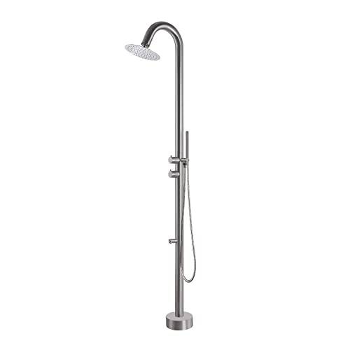Einfache Regenbrausen eignen sich für eine schnelle Abkühlung von oben. Eine Edelstahl-Gartendusche mit Handbrause ist die ideale Wahl, wenn Sie die Brause in der Hand halten und führen möchten. Zudem verfügen viele Modelle über eine Fußdusche, die im unteren Drittel der Gartendusche angebracht ist. Mit dieser können Sie mühelos Ihre Füße reinigen, ehe es beispielsweise für Sie in den Pool geht.