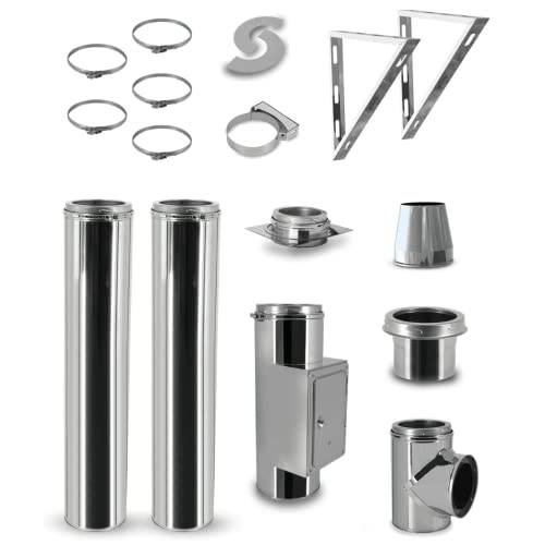 Das Ø 150 mm - 6,2 m Schornstein Paket doppelwandig - Wandmontage bietet eine hohe Hitzebeständigkeit, eine einfache Montage und Flexibilität bei der Gestaltung Ihres Wohnraums. In Kombination mit einer dekorativen Kaminhaube ist es die gute Ergänzung für jeden Kamin- oder Holzofenliebhaber.