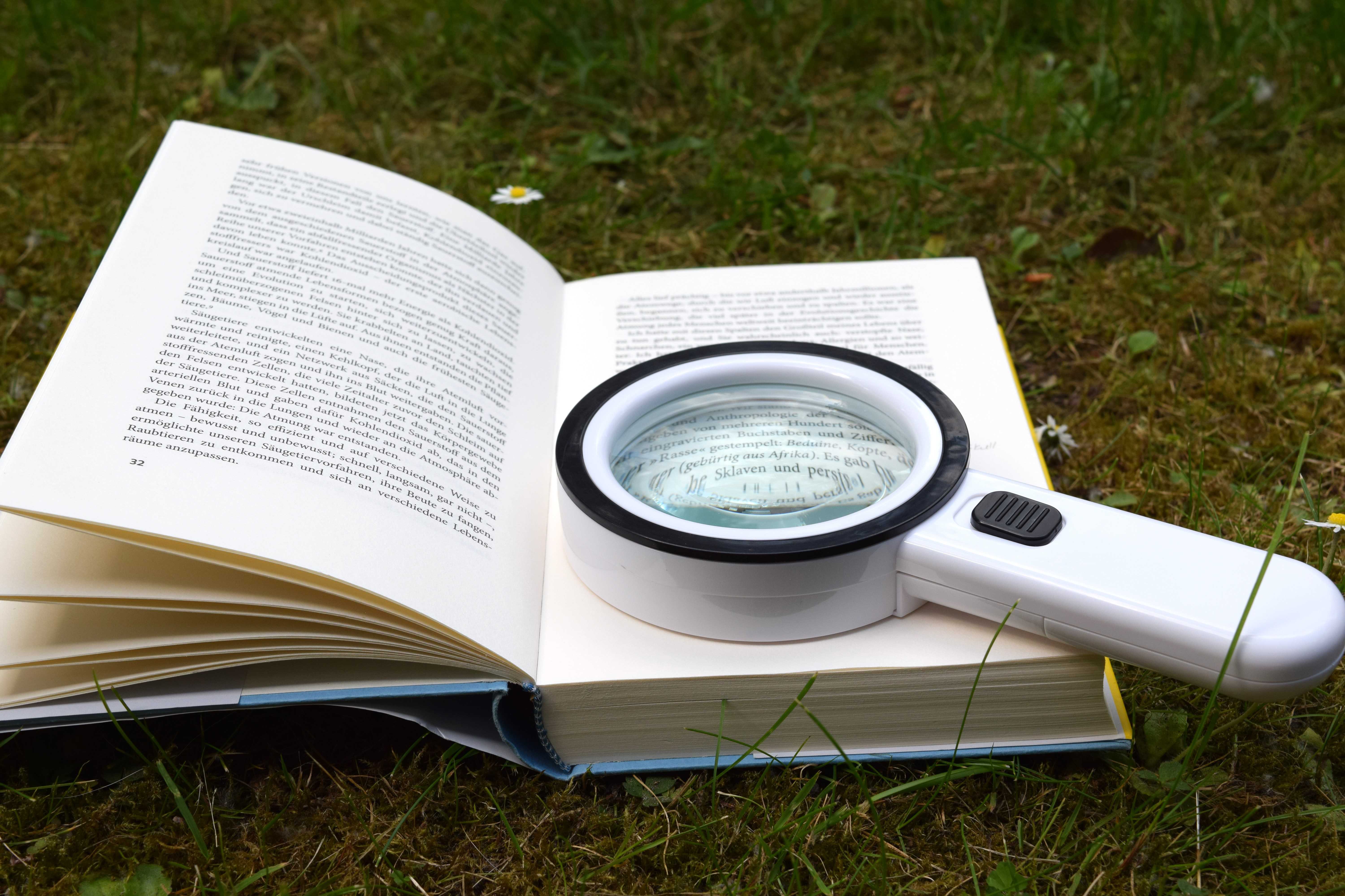 Praktisch finden wir Lupen, die einen Aufsatzrand aufweisen, wie diese elektronischen Lupe, die dadurch automatisch den optimalen Abstand zur Schrift aufweisen.