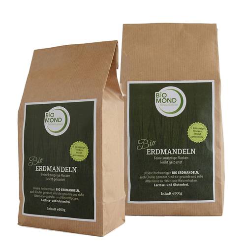 Erdmandelflocken, auch Chufas, Tigernüsse oder Chufa-Nüssli genannt, werden aus der gleichnamigen Erdfrucht gewonnen. Die Inhaltsstoffe von Erdmandelflocken sind reich an Ballaststoffen und Mineralien. Das enthaltene Eiweiß ist auch leicht zuträglich für den Körper.