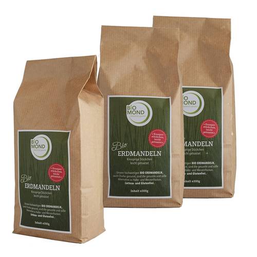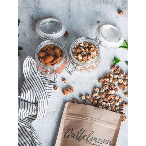 Bei Tests von Erdmandeln im Internet werden verschiedene Tütengrößen vorgestellt. Kleinere Packungen von 200 g können als Snacks am Abend ganz gegessen werden. Größere Tüten dagegen können als Vorrat angelegt werden, wo man jeden Morgen eine Handvoll für das Frühstück verwendet. Sehr große Packungen sind bei Fischern sehr beliebt, da Erdmandeln gute Köder abgeben.