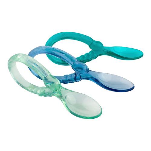 Tipp: Ist das Esslernbesteck vorne abgewinkelt, achten Sie darauf, welche die bevorzugte Esshand Ihres Kindes ist. Isst es vorwiegend mit rechts, muss der Löffel nach links zeigen. Wenn links die Lieblingshand ist, muss der Löffel nach rechts gebogen sein.