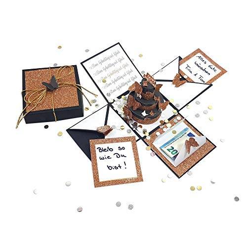 Sie wollen eine Explosionsbox kaufen und wissen nicht, wie Sie sie gestalten sollen? Vor allem kreative Köpfe können sich dabei mal richtig ausleben. Sie finden zu Explosionsboxen viele Ideen im Internet. Die vielen Flächen und Karten der Box können bemalt, beklebt oder anderweitig gestaltet werden. Explosionsboxen-Tests im Internet zeigen, dass besonders Boxen mit vielen gestaltbaren Flächen und Fächern sehr beliebt sind.
