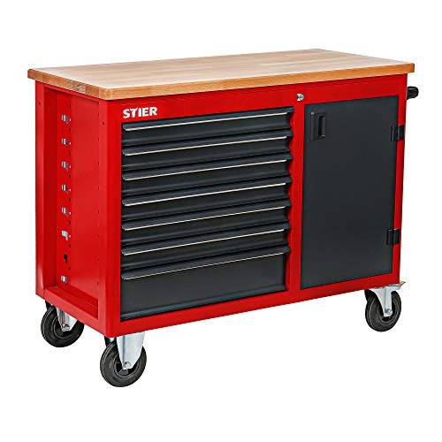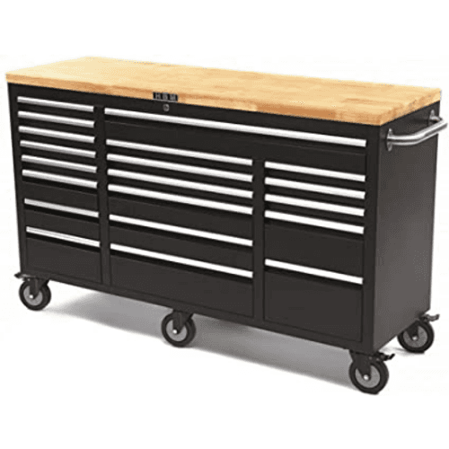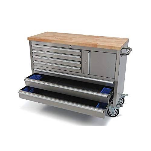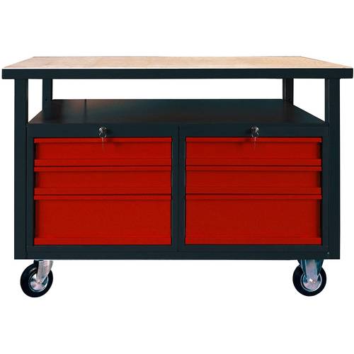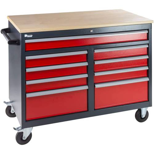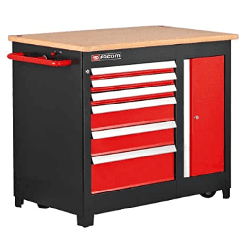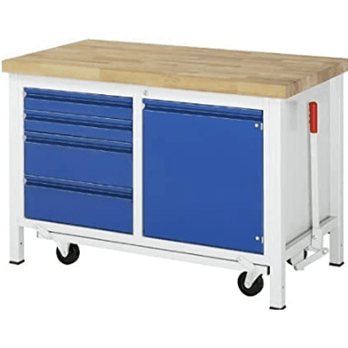 Tipp: für ein leichtes Verschieben der Rollwerkbank achten Sie auf das Vorhandensein einer Lenkstange. Je schwerer ein Modell ist, desto schwieriger lässt es sich fahren. Sind mehrere Schubfächer und Schränke vorhanden, ist eine Lenkstange aus Stahl ebenfalls von Vorteil. An der Seite Ihres mobilen Arbeitsplatzes sorgt sie für eine leichtgängige Handhabe.
