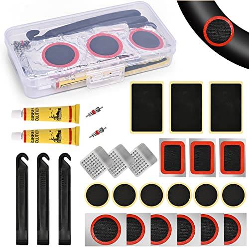 Das Flickzeug-Set: Dieses Kit ist weniger für Mechaniker als für diejenigen, die sicher sein wollen, dass sie einen platten Reifen reparieren können. Kurz gesagt, es eignet sich praktisch nur für eine Reifenschlauch-Reparatur. Eine Aufbewahrungsbox enthält, je nach Ausführung, mehrere Flicken (häufig selbstklebend), Gummikleber, Metallraspeln sowie Reifenheber. Ein sehr einfaches Kit und sehr bequem zum Mitnehmen.