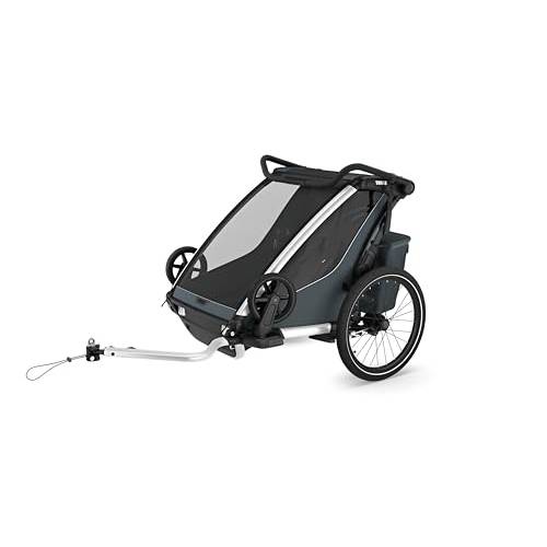 Hier sehen wir einen Hamax-Pioneer-Fahrradanhänger, der für bis zu zwei Kinder am Rad, zu Fuß oder mit Skiern genutzt werden kann.
