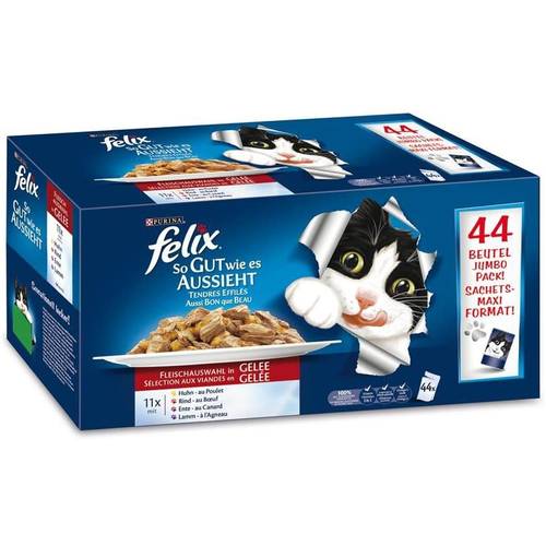 Felix-Katzenfutter in Gelee wird im Internet häufig in großen Packungen von 44 bis 120 Portionseinheiten verkauft, was wir als positiv bewerten. Da eine Katze zwei bis drei Beutel oder Schälchen Felix-Katzenfutter mit nassen Fleischstückchen pro Tag verschlingt, ist der Vorratskauf äußerst praktisch.
