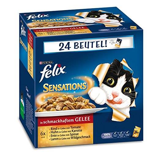 Platz 5 | Purina Felix Sensations Fleischauswahl in Gelee | ca. 58 € | ausgewachsene Katzen | sehr gute Akzeptanz |