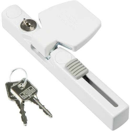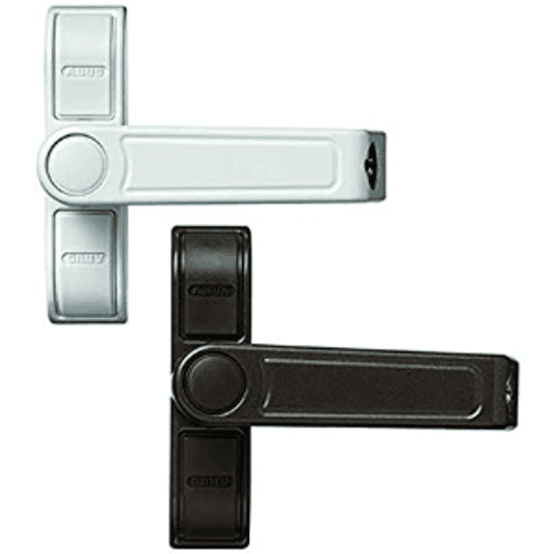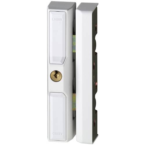 Auf diesem Bild sehen wir eine robuste Abus-Fenstersicherung, die aus zwei Blöcken mit Schlüssel besteht.