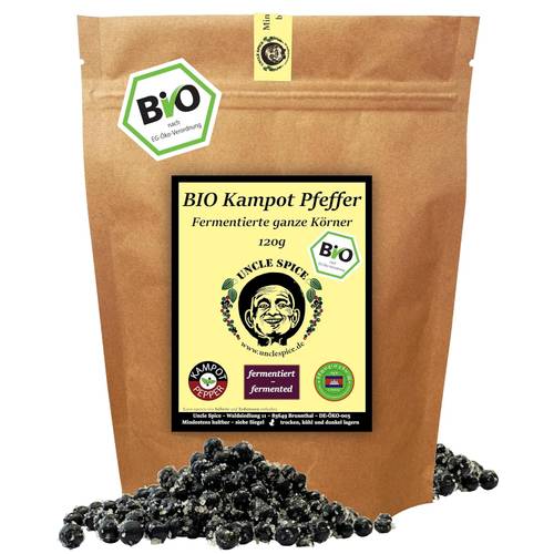 Der Uncle Spice fermentierte Bio-Kampot-Pfeffer ist ein Premium-Gewürz aus Kambodscha, direkt von kleinen Pfefferfarmen in Kampot und Kep. Mit 120 g pro Packung bietet dieser fermentierte Pfeffer, hergestellt nach alter ökologischer Tradition, ein intensives Aroma. Die grünen Pfefferbeeren, verfeinert mit 5 % Meersalz, werden handverlesen und schonend fermentiert, um ihre frischen Aromen zu bewahren. Jede Ernte wird sorgfältig geprüft, um höchste Qualität zu gewährleisten. Dieser Pfeffer eignet sich für Steaks, Salate und gegrilltes Gemüse. Geliefert in einem wiederverschließbaren, vakuumierten Beutel, bleibt das Aroma lange erhalten.
