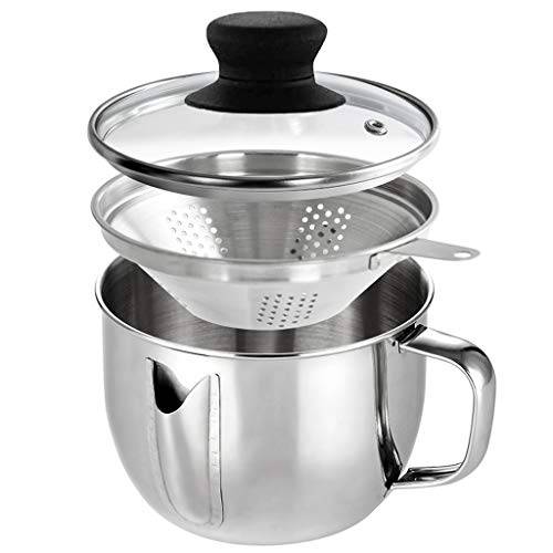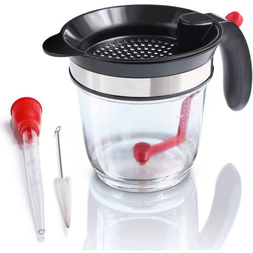 Um das Fett bei der Anwendung mit einer Fetttrennkanne restlos zu entfernen, ist eine Fetttrennkanne so ähnlich aufgebaut wie ein Messbecher. Der Unterschied liegt darin, dass bei der Trennkanne zusätzlich ein Sieb enthalten ist, damit nur die Flüssigkeit durchgelassen wird. In die Fetttrennkanne mit Sieb können Sie die Flüssigkeit problemlos hineingießen.