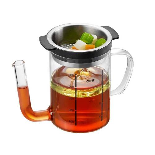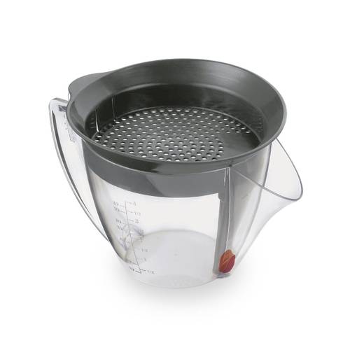 Tipp: An jeder guten Fettrennkanne sollte ein Sieb vorhanden sein. Es bildet den ersten Schritt der Soßen-Filterung.