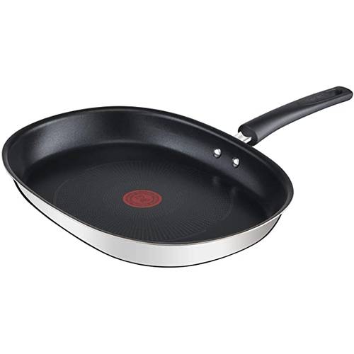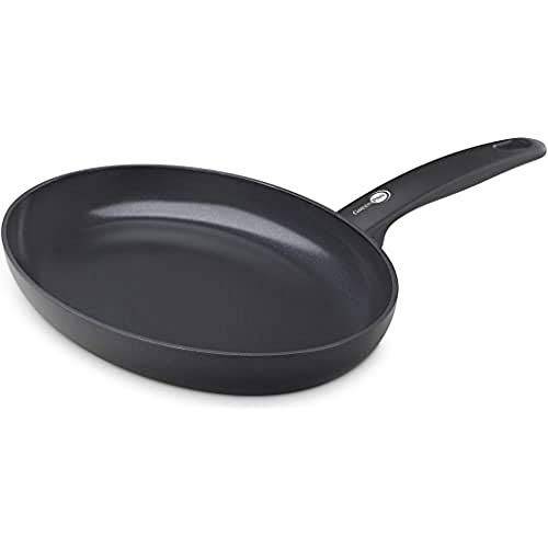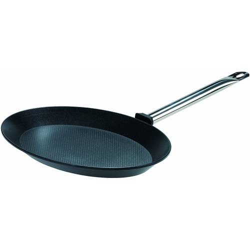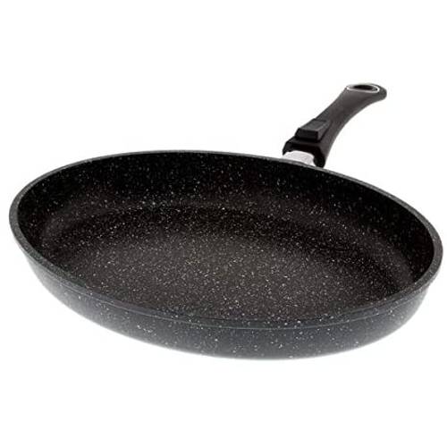 Hier sehen wir die Stoneline-Fischpfanne, die eine ovale Form (35 x 24 cm) hat und auch für Schnitzel geeignet ist.