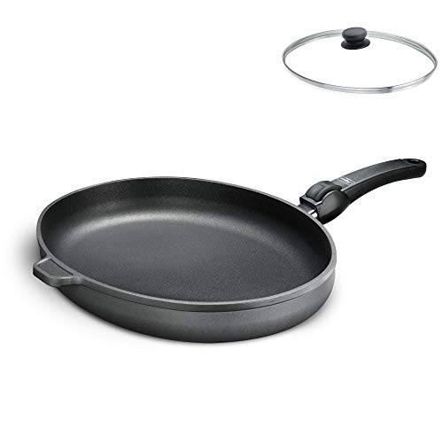 Fischpfannen sind häufig oval und mit Deckel versehen, sodass auch das langsame Garen kein Problem darstellt. Fischpfannen mit Glasdeckel erlauben außerdem eine ständige Beobachtung, sodass dem perfekt gebratenem oder gedünsteten Fisch nichts mehr im Wege steht. Dass Fischpfannen eine ovale Form haben, begünstigt zudem das Braten mehrerer länglicher Fische in einer Pfanne.