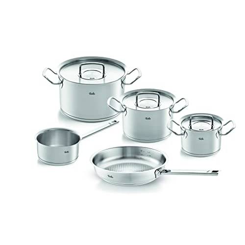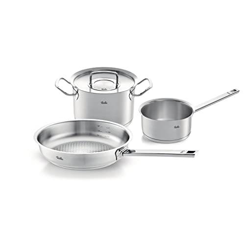 Für Single-Haushalte sind 3-teilige Fissler-Topfsets mit einem Fassungsvermögen von bis zu fünf Litern meistens ausreichend. Familien sollten eher auf 5-teilige Topfsets zurückgreifen. Bewirten Sie gerne Gäste oder kochen Sie ausgefallene Menüs, dann sind größere Topfsets für Sie ebenfalls empfehlenswert. Für Eintöpfe und Suppen darf ein Topfset auch einen großen Topf mit 10 Litern oder 15 Litern Fassungsvermögen enthalten.