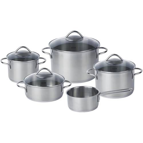 Der Superthermic-Boden des Fissler-Intensa-Topfsets soll besonders energiesparend sein. Die breiten Kunststoffgriffe sind in verschiedenen Farben erhältlich. Dank eines Flammschutzes aus Edelstahl können Sie das Set auch auf Gasherden nutzen. Das Topfset Bonn ist mit dem Intensa-Topfset von Fissler vergleichbar, ist aber mit Glas- anstatt Metalldeckeln ausgestattet.