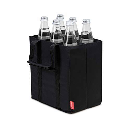 Sehr leicht und gut zu verstauen sind Flaschentaschen aus Baumwolle, denn sie können prima zusammengefaltet werden. Allerdings ist diese Flaschentasche für einzelne 1,5-Liter-Flaschen gedacht. Mehrere Getränkeflaschen passen nicht hinein. Die Stofftasche können Sie sogar in der Waschmaschine bei ca. 30 Grad Celsius reinigen.