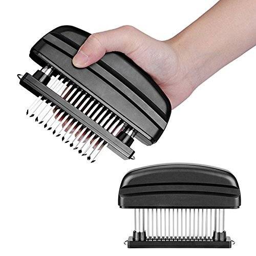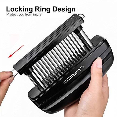 An der Unterseite der Halterung sind die Klingen eingearbeitet. In unserem Fleischzartmacher-Vergleich finden Sie Modelle mit mindestens 35 bis 56 Klingen. Diese Klingen sind nadelförmig und stanzen sich erst durch Druck in das Fleisch. Davor sind sie von unten durch eine Platte geschützt.