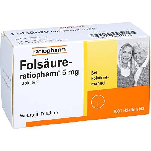 Platz 4 | Ratiopharm Folsäure | ca. 13 € | 5.000 μg 1 Tablette pro Tag | |||