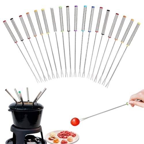 Verschiedene Farbelemente dienen dem Unterscheiden der Gabeln. Wenn Sie ein Fonduegabel-Set kaufen, sind alle Fonduegabeln gleich lang. Um jedem Gruppenmitglied eine Fonduegabel zuteilen zu können, haben die meisten Modelle verschiedene Farben, die sich oft am Ende des Griffs befinden. Manche Produkte bringen die Farben im kompletten Griff unter, nehmen die Unterscheidung mithilfe von Zahlen oder Wörtern vor oder platzieren ein farbiges Element – zum Beispiel aus Silikon – im mittleren Teil der Gabeln.