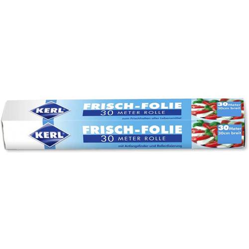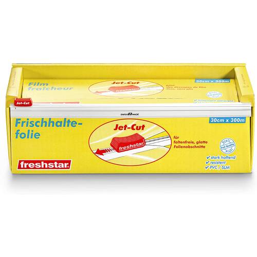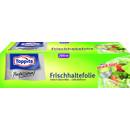 Hier haben wir uns die Verpackung der Gut-&-Günstig-Firschhaltefolie mit 75 m Länge genauer angeschaut. Sie besitzt eine Perforierung, um die Rolle einzuspannen.