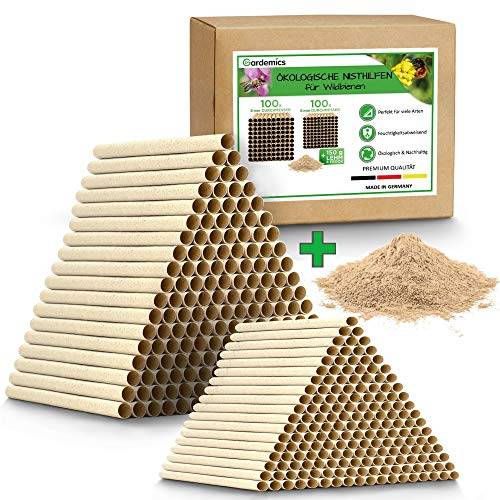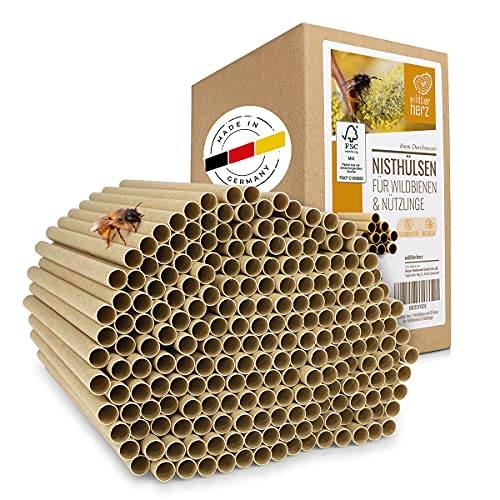 Auch unterschiedlich große Nisthülsen eignen sich gut als Wildbienenhotel-Füllmaterial, damit große und kleine Bienen Unterschlupf finden. Mit etwas Lehmpulver können Sie eine Seite der Röhrchen verschließen, damit sich die Bienen geschützt fühlen. In andere Kammern können Sie zusätzlich Zapfen und Äste legen, um optimale Bedingungen für eine Vielzahl an wichtigen Insekten zu schaffen.