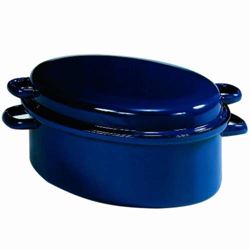 Auf diesem Bild sehen wir einen klassischen Gänsebräter aus blau emailliertem Stahl in der typischen, ovalen Form.