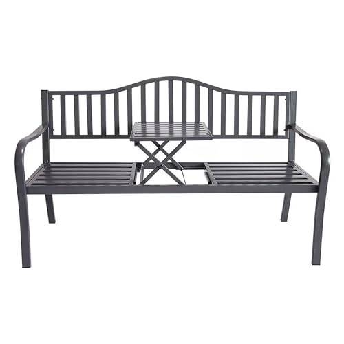 Bei 2-in-1-Gartenbänken aus Metall handelt es sich um Metall-Gartenbänke mit Tisch. In der Mitte der Sitzfläche ist ein Klapptisch integriert. Wird dieser benötigt, lässt er sich einfach ausklappen. Bei Nichtnutzung wird der Tisch wieder ein Teil der Sitzfläche. 2-in-1-Gartenbänke aus Metall lohnen sich für kleine Gärten, Balkone oder Terrassen. Sie sind platzsparend und praktisch.
