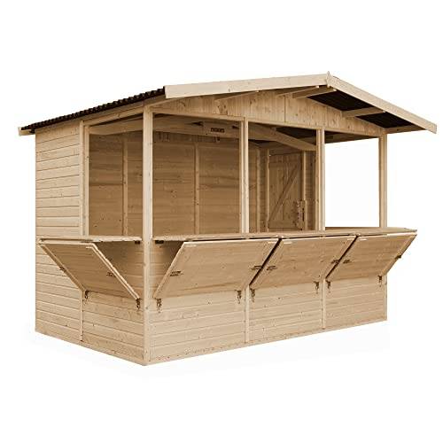 Das Timbela M150B Gartenhaus präsentiert sich als vielseitige Option. Als Pop-up Marktstand aus Holz ist es leicht auf- und abbaubar, ideal für Märkte und Veranstaltungen. Mit einer abschließbaren Fensterluke als Theke fungiert es als Verkaufspavillon und Servicefläche. Zudem kann es als Gartenbar genutzt werden, um die Unterhaltung nach Hause zu bringen.