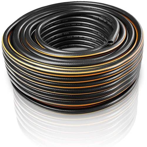 Wem die Ästhetik in seinem Garten wichtig ist, sollte auch einen Blick auf die Farbe des Gartenschlauchs werfen. Dieser Geolia-Gartenschlauch ist schwarz-silber-grün.