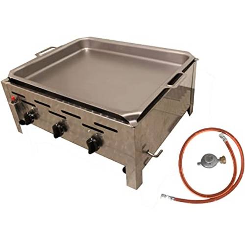 Gasbräter werden mit handelsüblichem Propan-/Butan-Gas betrieben. Ein Gasschlauch und Druckminderer sind im Lieferumfang enthalten.