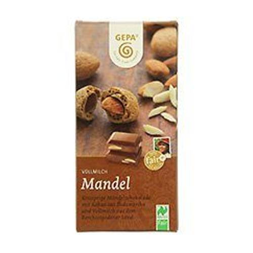 Diese GEPA-Schokolade „Vollmilch-Mandel“ besteht aus mindestens 38 % Kakao (Kakaomasse), 20 % Vollmilchpulver, 20 % Mandeln, Kakaobutter, Vollrohrzucker, Rohrohrzucker und Vanilleextrakt .