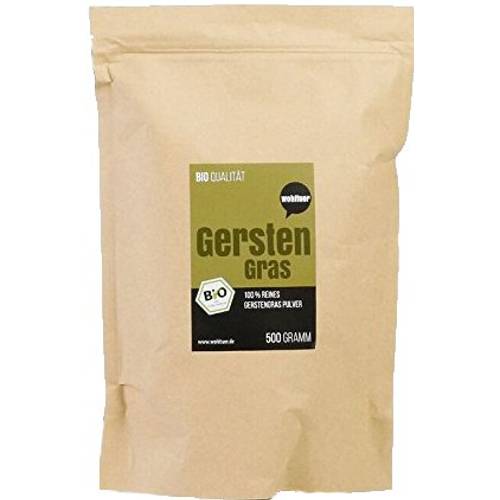 Auf diesem Bild sehen wir eine 500-g-Packung Raab-Gerstengras in Bio-Qualität, das fein gemahlen ist.
