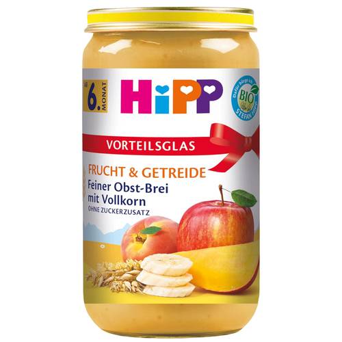 Platz 1 | Hipp Frucht & Getreide Feiner Obst-Brei mit Vollkorn | ca. 10 € | Vollkornweizenflocken | Apfel, Mango, Banane, Pfirsich | ||