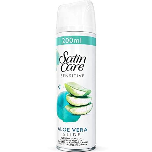 Dieses Gillette-Rasiergel „Satin Care“ setzt auf Aloe Vera und wurde laut Hersteller für Frauen entwickelt.