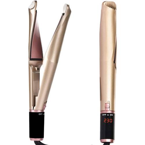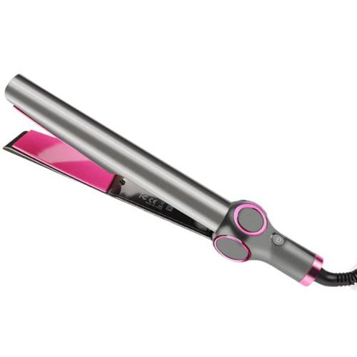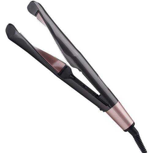 Der Remington-Locken-Haarglätters „Curl & Straight Confidence“ hat über die Heizplatten hinausstehend ein kühles Ende, das uns hier demonstriert wird und einen beidhändigen Umgang ermöglicht.