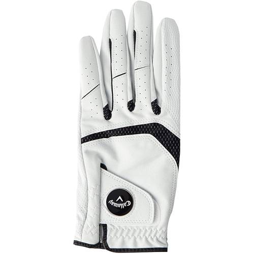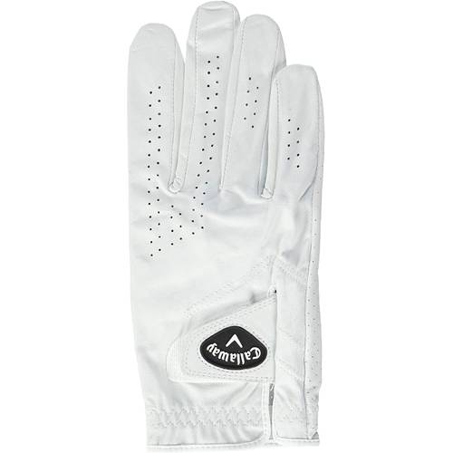 Der Callaway-Syntech-Golfhandschuh ist in verschiedenen Größen und jeweils für die rechte und linke Hand erhältlich. Er besteht aus synthetischem Leder.
