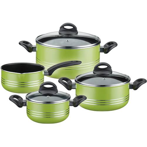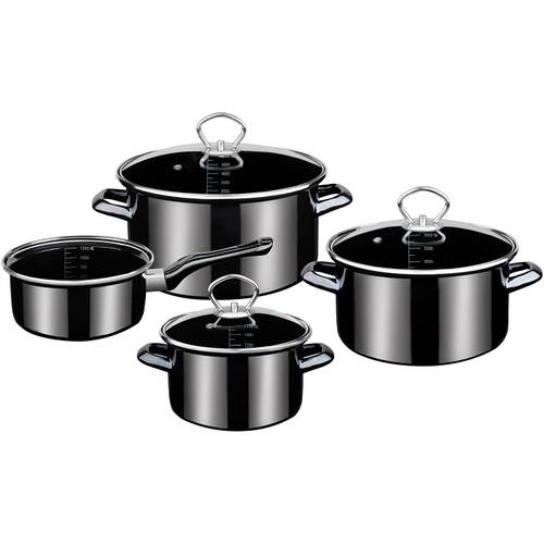 Töpfe, Deckel und die Kasserolle bestehen aus Stahl, der zum Schutz gegen Korrosion emailliert wurde. Die Griffe der Deckel sind aus Kunststoff, damit man sich beim Anfassen nicht die Finger verbrennt.
