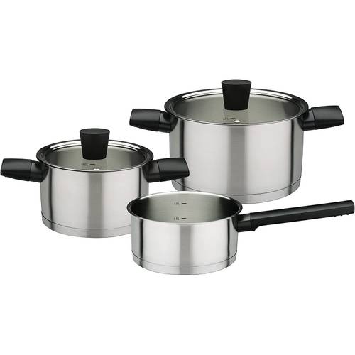 Das dreiteilige GSW 900201 NOVERO Topf-Set aus Edelstahl im Silber-Design sticht in unserem Vergleich durch seine angenehmen Griffe heraus. Zudem lassen sich die Töpfe für verschiedene Zwecke verwenden und sind dabei kratzfest.