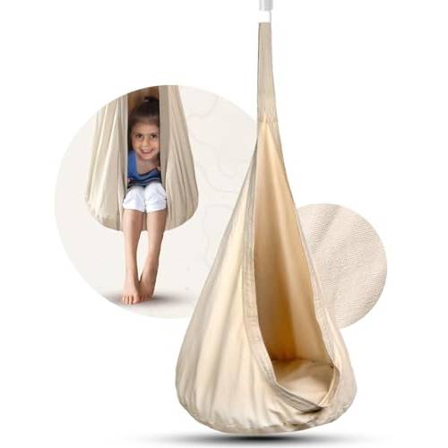 Es handelt sich um ein Stück Stoff, das – ähnlich wie ein Sack – an der Decke herunterhängt. Um für eine gute Stabilität zu sorgen, befindet sich im Inneren ein Sitzkissen. Auf diesem Kissen können Kinder und Erwachsene es sich bequem machen. Es ist zudem ein idealer Rückzugsort für Kinder.