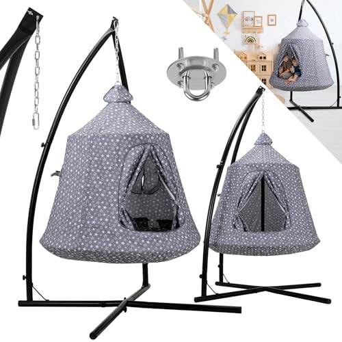 Unter Umständen ist es eine Überlegung wert, eine Hängehöhle mit Gestell zu kaufen. Wenn Sie in einer Mietwohnung leben, kann das sinnvoll sein. Dann brauchen Sie keine Löcher in die Decke zu bohren, die Sie beim Auszug wieder verputzen müssen. Ein solches Modell erhalten Sie zum Beispiel als Hängehöhle bei IKEA.
