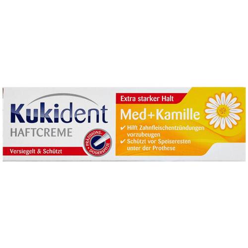 Kamille ist bekannt für ihre antiseptische und beruhigende Wirkung, weshalb sie auch in dieser Kukident-Professionell-Haftcreme „Med+Kamille“ enthalten ist.