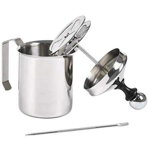 Hand-Milchaufschäumer aus Edelstahl/Aluminium | robust und langlebig sehr leicht zu reinigen können auf dem Herd erhitzt werden meist etwas schwerer nicht für Induktionsherde geeignet |