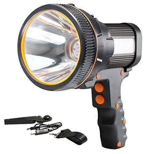 Die Betriebsdauer hängt in erster Linie davon ab, mit welchem Batterie-Typ der Handscheinwerfer ausgerüstet ist und wozu der Handstrahler verwendet wird. In einem leistungsstarken LED-Suchscheinwerfer mit Powerbank-Akku (9.600 mAh) können Sie bei voller Helligkeit mit bis zu 10 Stunden Dauerbetrieb rechnen.