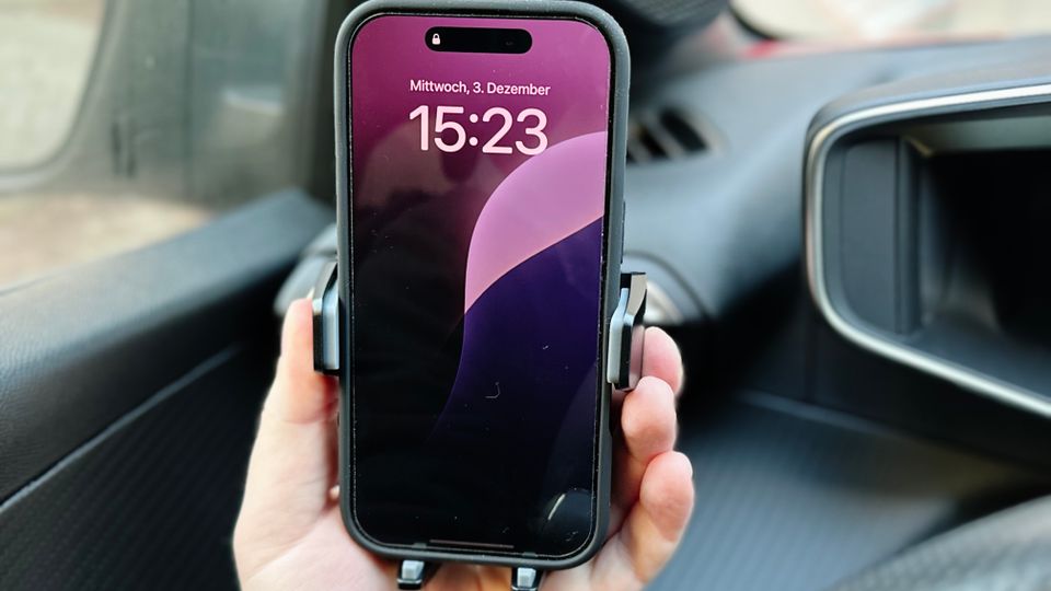 Die Kombination aus automatischem Klemmmechanismus, Kugelgelenk und zusätzlichem Halt am unteren Steg funktionierte durchgehend zuverlässig. Auch bei größeren Smartphones mit Hülle zeigte sich die Halterung als robust. Ein geringes Spiel bei schmalen Geräten fiel im Test kaum ins Gewicht.
