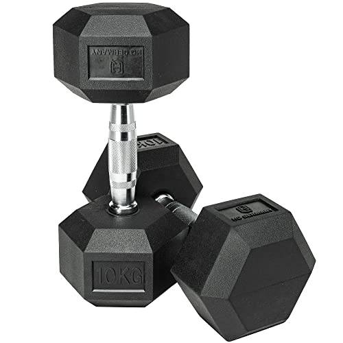 10-kg-Hanteln aus Gummi oder Neopren eignen sich vor allem, wenn Sie den Boden in Ihrem Wohnzimmer nicht zerkratzen möchten. Außerdem bieten sie eine komplett wasserfeste Oberfläche und lassen sich auch problemlos draußen verwenden.