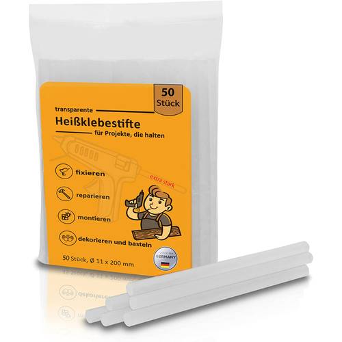 Heiß- oder Schmelzkleber sind in ihrer festen Form als Stick fast unbegrenzt haltbar. Es gibt farbige und transparente 11-mm-Klebesticks. Der 11-mm-Heißkleber eignet sich für sehr viele verschiedene Materialien. Papier, Pappe, Kork, Holz, Glas, Kunststoffe, Metall, Textilien, Stein oder Keramik gehören unter anderem zu den Materialien, die mit den meisten 11-mm-Heißklebestiften verklebt werden können.
