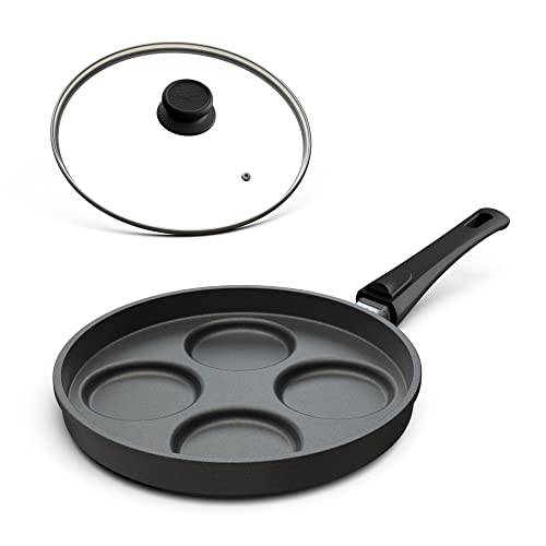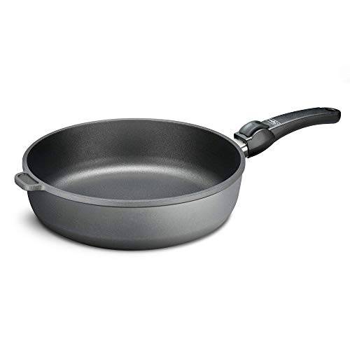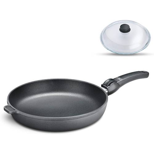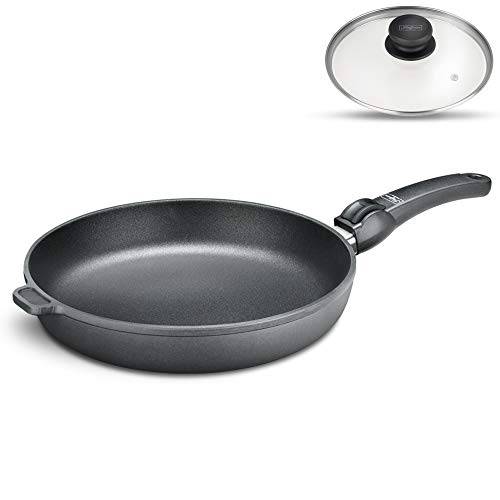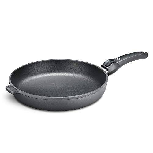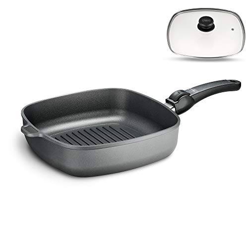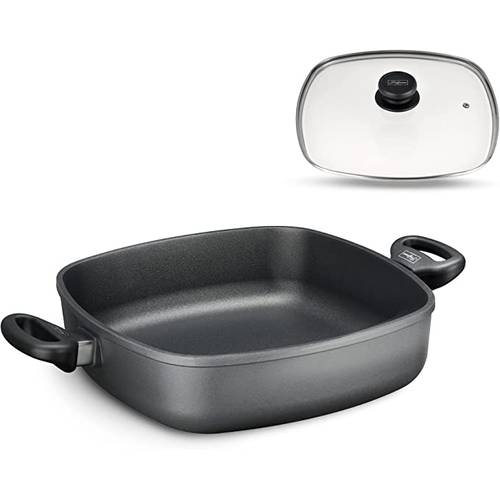 Uns gefällt die viereckige Form der Hoffmann-Gusspfanne mit 28 x 28 Zentimeter. Sie ist durch die Form und die Höhe ideal für Gemüsegerichte und Speisen mit viel Soße. Praktisch sind die abnehmbaren Griffe, denn dadurch ist die große Pfanne nicht nur für alle Herdarten geeignet, sondern auch für den Backofen. Eine lange Lebensdauer garantiert die Versiegelung mit drei Schichten, die zertifiziert sind und für einen sorgenfreien Genuss sorgen. Der Hersteller setzt auf Nachhaltigkeit und bietet seinen Kunden einen Wiederbeschichtungsservice an. Wir empfehlen dieses Produkt allen, die eine große Pfanne wollen und Qualität schätzen.