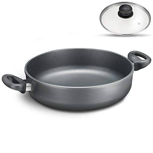 Diese Pfanne verfügt über einen 6 cm hohen Rand. Das bietet den Vorteil, dass in ihr auch höhere Stücke Fleisch angebraten und Gerichte mit mehr Flüssigkeit zubereitet werden können.